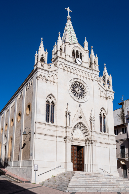La facciata principale appare alta e slanciata grazie alla presenza di quattro lesene che ne accentuano il senso di verticalità e della grande guglia-campanile rivestita da maioliche calatine bianche e verdi.